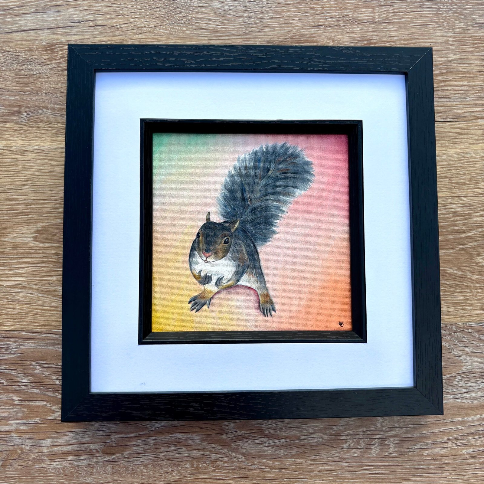 INSPIRATION: This piece was inspired by a bold little squirrel I saw in London. He stood with a defiant pose, looking up with an air of expectation, as if he had something important to say. There was a real confidence in his stance that made me stop and wonder what story had led him to be so fearless. That moment stuck with me and I knew I had to paint him. He may be small but he carries himself with a kind of swagger that demands attention.