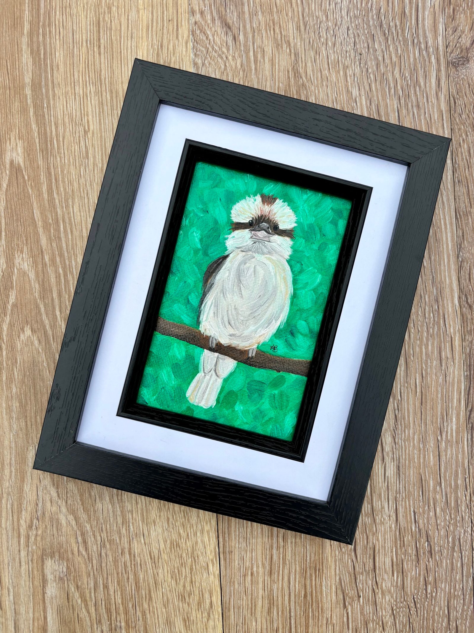 INSPIRATION: Inspired by my first encounter with a kookaburra at Hoo Zoo, this piece reflects the quiet tension of that moment. The bird stared straight ahead, as if deciding whether to break the silence with its iconic laugh. Kookaburras are known as “bushman’s clocks,” their laughter echoing through the trees at dawn and dusk. Yet this one remained still, almost contemplative. Through this painting, I wanted to capture that pause, the space between sound and silence.